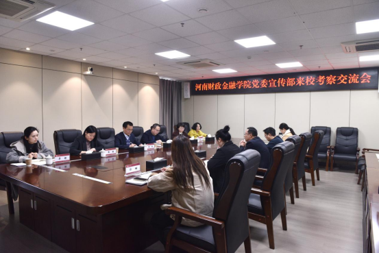 为进一步加强高校宣传思想工作交流互鉴,推动宣传工作提质增效、协同发展,3月20日上午,河南财政金融学院党委宣传部部长崔潮率队,副部长戴亚军、张颖、杨康宁及相关科室工作人员随同来访莅临我校,我校党委宣传部常务副部长苏辉,副部长郝慧娟、高峥及宣传部相关科室人员陪同,在行政楼901会议室进行交流座谈,双方就高校宣传工作的经验做法、创新路径与发展方向进行了深入探讨。