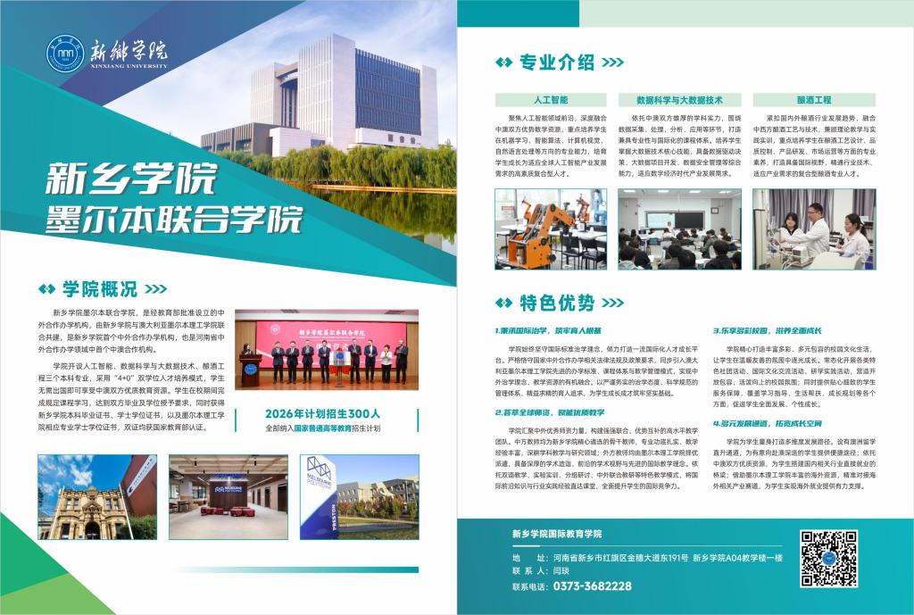 永利yl23411集团官网墨尔本联合学院,是经教育部批准设立的中外合作办学机构,由永利yl23411集团官网与澳大利亚墨尔本理工学院联合共建,是永利yl23411集团官网首个中外合作办学机构,也是河南省中外合作办学领域中首个中澳合作机构。学院开设人工智能、数据科学与大数据技术、酿酒工程三个本科专业,采用“4+0”双学位人才培养模式,学生无需出国即可享受中澳双方优质教育资源。学生在校期间完成规定课程学习,达到双方毕业及学位授予要求,同时获得永利yl23411集团官网本科毕业证书、学士学位证书,以及墨尔本理工学院相应专业学士学位证书,均获国家教育部认证。学院2026年计划招生300人,全部纳入国家普通高等教育招生计划。