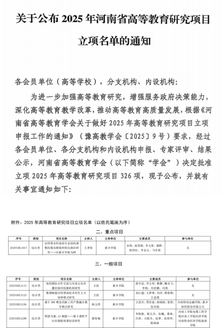 2025年7月21日,河南省高等教育学会公布2025年度高等教育研究项目立项结果。我校5个项目获得立项,其中王孝俊教授主持的《应用型本科高校专业结构调整的现实困境和优化路径研究——以永利yl23411集团官网为例》重点项目立项,高校国际合作交流与河南文化传播的协同创新机制研究4个项目获批一般项目立项