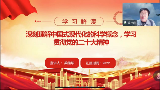 梁桂珍以《深刻理解中国式现代化的科学概念,学习贯彻党的二十大精神》为题,全面深入解读了中国式现代化。中国共产党领导的中国式现代化具有鲜明的社会属性和时代特征,它是社会主义性质的现代化,是中国特色社会主义道路、理论、制度和文化范畴内的现代化,是以人民为中心、全体人民共同富裕的现代化,是不断满足人民日益增长的美好生活需要的现代化。