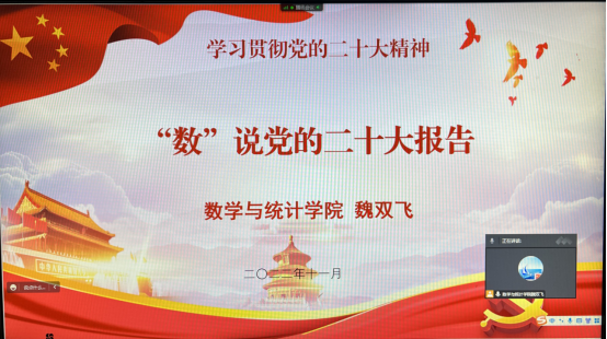 11月15日下午,根据学校党委安排部署,数学与统计学院党委开展党的二十大精神专题宣讲,学院全体教师参加学习,党委书记魏双飞、院长梁桂珍进行了专题宣讲。