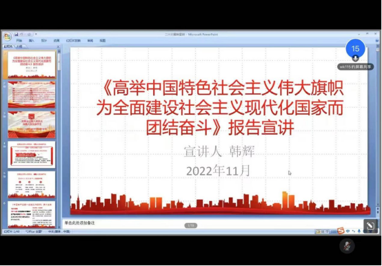 为深入学习宣传贯彻党的二十大精神,12月13日下午,机电工程学院邀请我校党的二十大精神宣讲团成员、党委组织部部长韩辉,采用线上会议的形式举行党的二十大精神宣讲报告。学院全体教职工、学生党员、青马班学员及学生干部代表共计300余人参加了学习,会议由机电工程学院党委书记赵素琴主持。